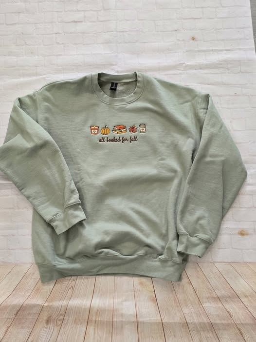 Get cozy this season with our “All Booked for Fall” embroidered crewneck. Featuring charming autumn icons—pumpkin, coffee, books, and more—this sweatshirt perfectly captures the fall vibes. Made with a soft, durable Gildan blend, it’s the ideal layer for crisp mornings, cozy nights in, or trips to the pumpkin patch.